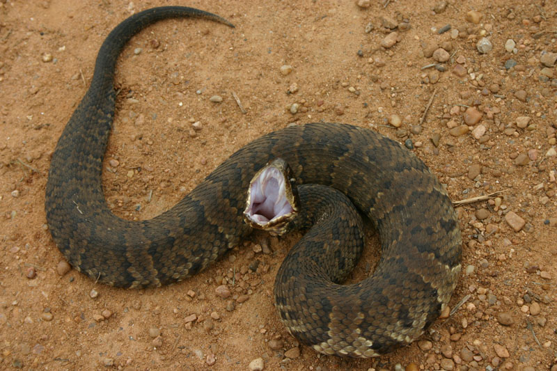 About this photo:This snake looks ferocious, but it is all an act. This is one of the most harmless snakes around, one that is not known to bite even when handled. We stopped at the Attwater Prairie Chicken National Wildlife Refuge on a drive back from Houston to Austin. The refuge represents a small detour that is usually worth the trouble. On this day in March, 2004, we didn't find much in the way of avifauna, but the flowers were nice. This guy was in the middle of the road. When we stopped to check it out, he started his performance, giving us a chance to snap this photo. If the threat performance proves ineffective, the snake often tries playing dead. It sometimes vibrates its tail in dry leaves to sound like a rattlesnake. |